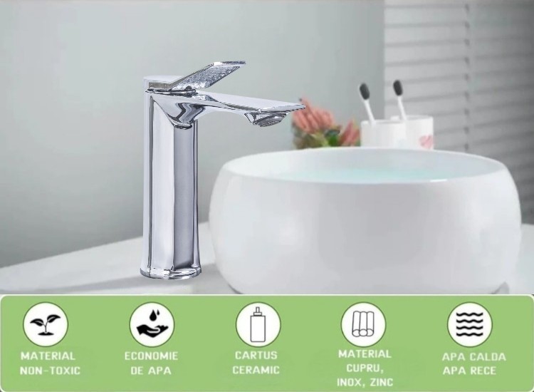 Aceasta baterie eleganta pentru baie combina un design modern cu functionalitate practica, fiind ideala pentru orice tip de amenajare.