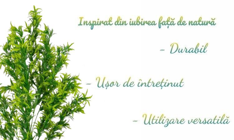 Aceasta planta decorativa artificiala, inspirata de frunzele subtiri si zimtate specifice ferigii, ofera un aspect dens si vibrant.