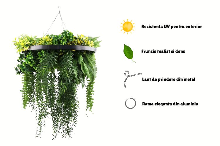 Aranjament Suspendat cu Plante Artificiale pe Disc Decorativ Negru, Naimeed D7446, diametru 60 cm, realizat dintr-o