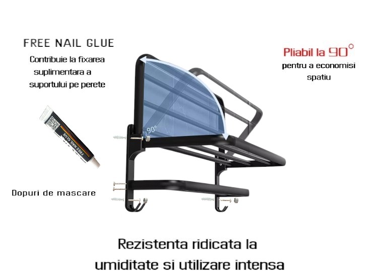 In plus, suportul se poate plia la 90°, economisind spatiu cand nu este utilizat, iar sistemul sau de montaj asigura o fixare ferma si durabila