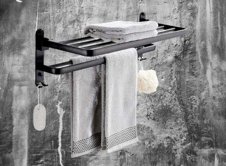 Design practic cu doua niveluri: Raft superior pentru depozitarea prosoapelor pliate, iar bara inferioara perfecta pentru uscarea prosoapelor sau a hainelor.